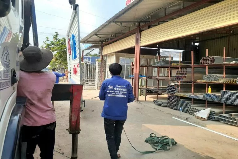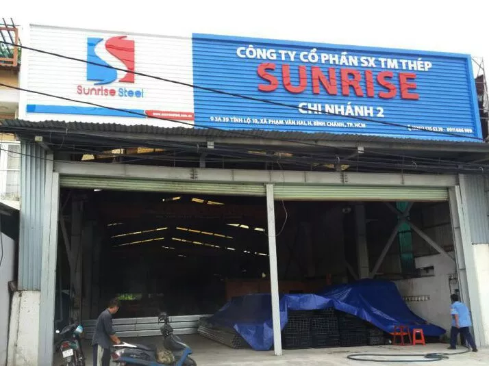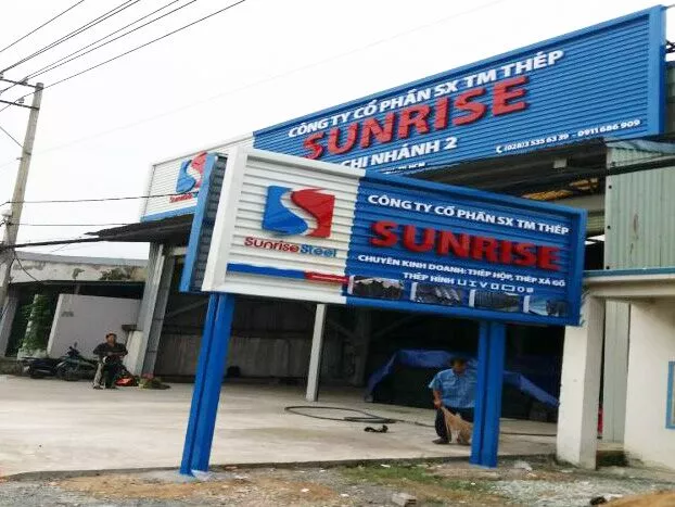 Công ty cổ phần SX TM thép SUNRISE ( Hồng ký cũ) địa chỉ QL1A, Long Hiệp, Bến Lức, Long An. Công ty sắt thép Sunrise là công ty cổ phần sắt thép xây dựng gốc là công ty máy công cụ Hồng Ký cũ. Công ty Tài quảng cáo là đối tác lắp đặt bảng hiệu cho các đại lý của công ty cổ phần Sunrise. Bảng hiệu chữ mica nổi trên nền tole sóng sơn tĩnh điện.