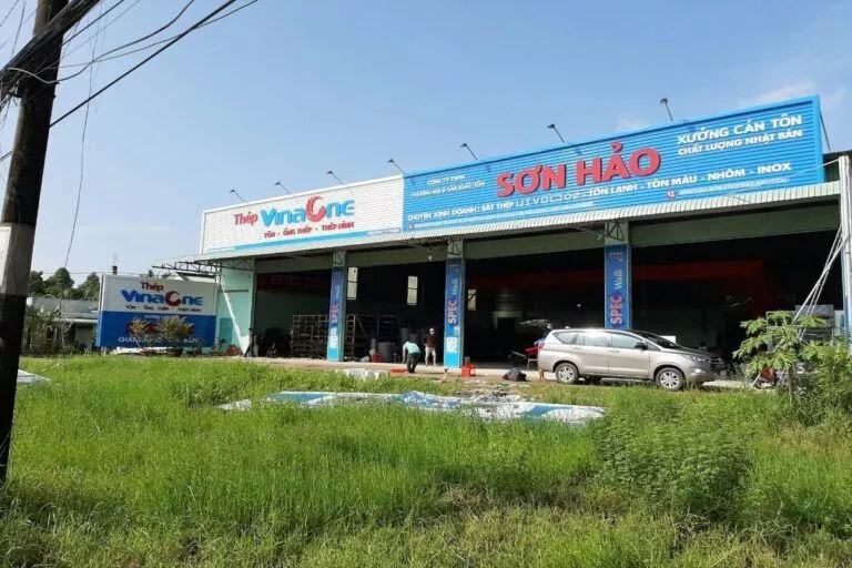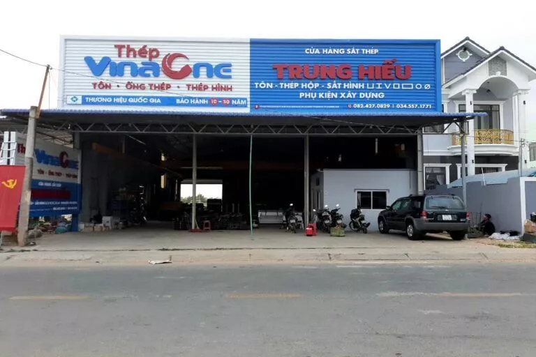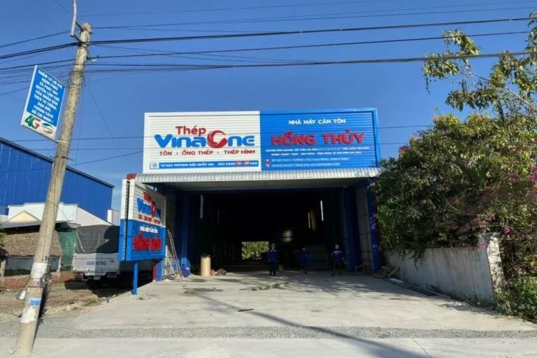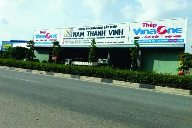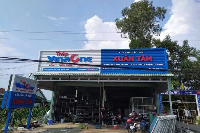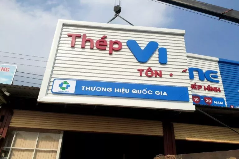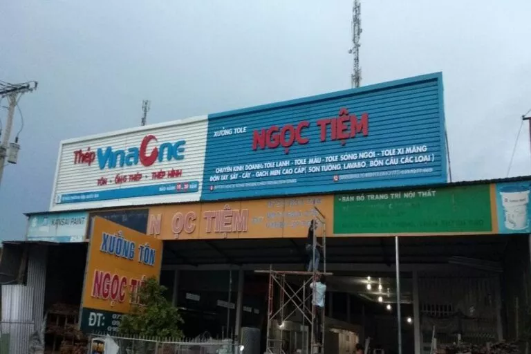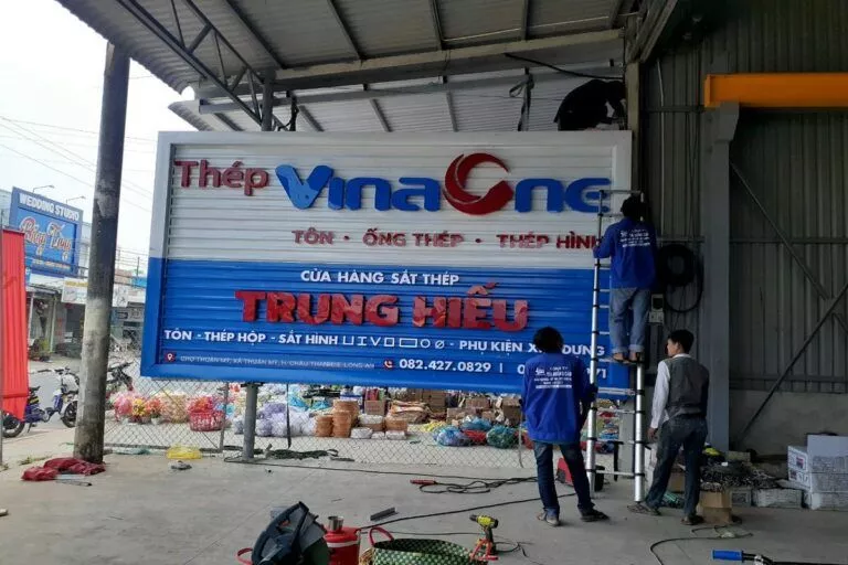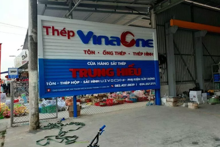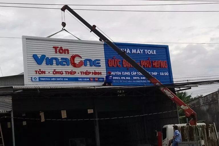 Tập đoàn cung cấp sắt thép, tole xây dựng… Công ty Tài quảng cáo thường xuyên lắp đặt cho tập đoàn VinaOne có trụ sở tại ấp Voi Lá, Long Hiệp, Bến Lức, Long An. Các bảng hiệu nhà xưởng hay bảng hiệu đại lý cung cấp vật liệu xây dựng có kích thước trung bình từ 50 mét vuông, có bảng hơn 100 mét vuông. Bảng lắp đặt bằng khung sắt, lợp tonle sóng sơn tỉnh điện. Chữ bằng mica nổi hay alu nổi độ bền trên 5 năm. Chữ mica nổi là mặt hàng thường xuyên cho bảng hiệu VinaOne.
